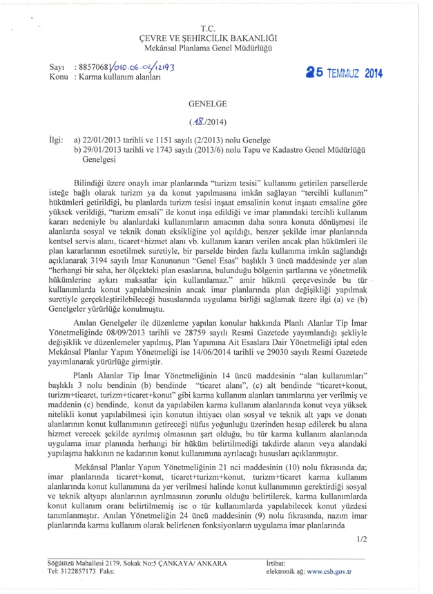 Yönetmeliğin (Değişik:RG-8/9/2013-28759) 14.maddesinde; “Kent bölgeleri tanımları ve alan kullanış şartları” düzenlenmiştir.Bu maddenin ( c ) fıkrasında ise karma kullanım alanları tanımlanmıştır.Buna göre; Ticaret+Konut, Turizm+Ticaret, Turizm+Ticaret+Konut gibi karma kullanım alanları: Tek başına konut olarak kullanılmamak koşuluyla, ticaret, turizm+ticaret, ticaret+konut, turizm+ticaret+konut kullanımlarından sadece birinin veya ikisinin veyahutta tamamının birlikte yer aldığı alanlardır.Bu alanlarda plandaki kullanım kararına bağlı olarak konut veya turizm tesisi yapılması halinde yoldan cephe alan zemin veya bodrum katların ticaret veya hizmetler sektörünün kullanımında olması ve konut veya turizm tesisi için ayrı bina girişi ve merdiveni bulunması şartı aranır. Bu alanlarda ayrıca plan kararı gerekmeden gerçek ve tüzel kişilere veya kamuya ait; yurt, kurs, dershane, ticari katlı otopark, sosyal ve kültürel tesisler yapılabilir. Ancak bu alanlarda katlı otopark, özel eğitim veya özel sağlık tesisi yapılabilmesi için uygulama imar planında bu amaçla değişiklik yapılması yapılarak karma kullanımdan çıkarılması gerekir. Ticaret+Konut, Turizm+Ticaret+Konut gibi konut da yapılabilen karma kullanım alanlarında konut veya yüksek nitelikli konut yapılabilmesi için konutun ihtiyacı olan sosyal ve teknik alt yapı ve donatı alanlarının konut kullanımının getireceği nüfus yoğunluğu üzerinden hesap edilerek bu alana hizmet verecek şekilde ayrılmış olması şarttır. Konutun da yapılabildiği karma kullanım alanlarında uygulama imar planında alanın veya alandaki yapılaşma hakkının ne kadarının konut kullanımına ayrılacağının belirlenmediği durumlarda konut kullanımları, alandaki parsellerin toplam emsalinin %20’sini aşamaz.
